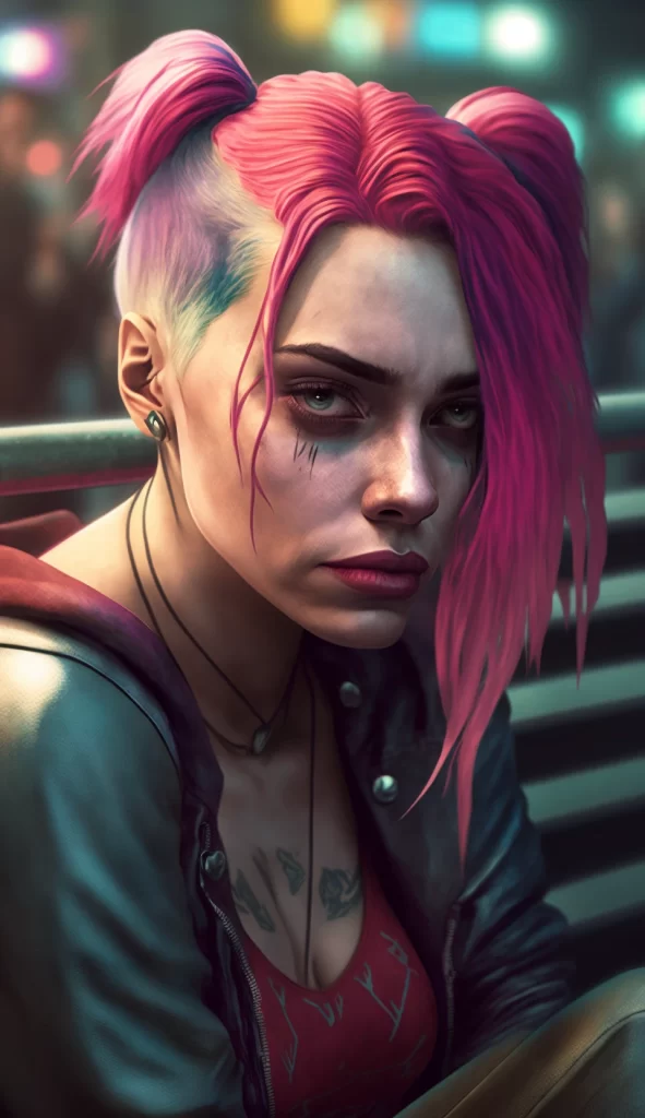 The AI prompt describes a cinematic scene with 4k ultra details and ultra realism. The scene features a woman who is dressed as Harley Quinn and appears to be sad. She has heavy eye liner and is sitting on a bench in a cyber punk city. The woman has glowing pink hair and her hair is braided. People can be seen walking in the background, adding to the realism of the scene. The aspect ratio of the scene is 9:16. The prompt paints a picture of a melancholic Harley Quinn in a futuristic city, creating a sense of contrast between the character’s sadness and the vibrant, colorful environment around.