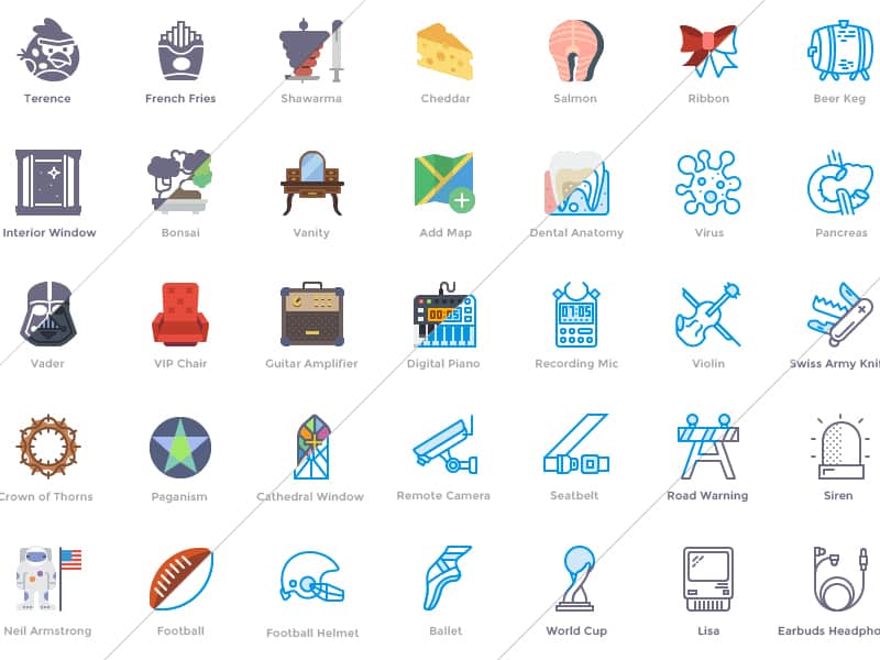Among Oliver’s featured creations is the Smashicons set. Composed of a whopping 14,000 icons, which are continuously being tweaked and added, Smashicons features elements under a wide range of categories. This includes medical, movies, file types, holidays, business, religion, and many others, all of which are available in four design styles: color, webby, outline, and solid.